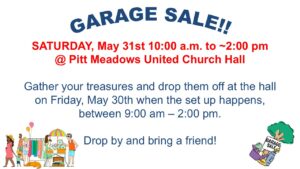 Garage Sale on May 31st at the Pitt Meadows United Church Hall, beginning at 10:00 am.
