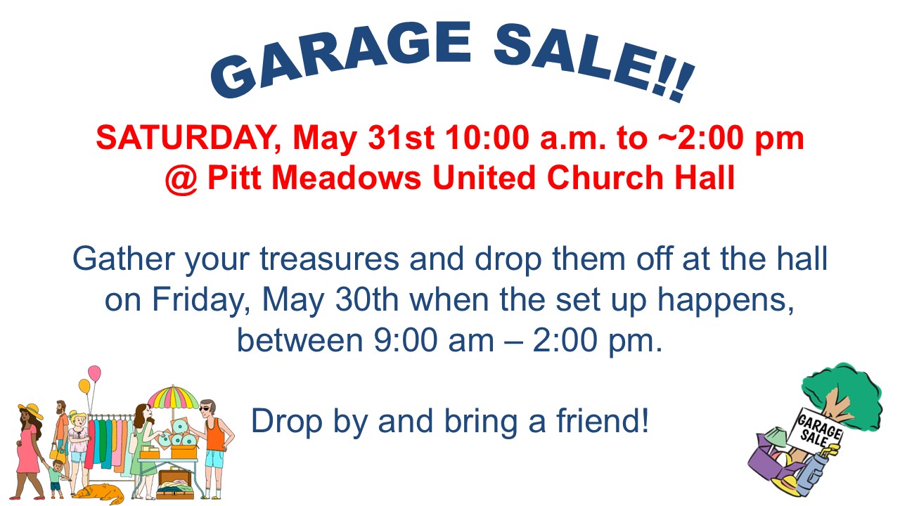 Garage Sale on May 31st at the Pitt Meadows United Church Hall, beginning at 10:00 am. All are welcome!